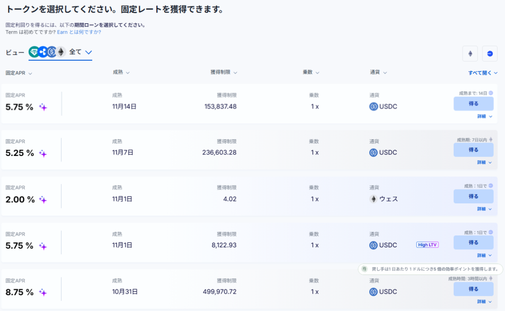 そのような時におすすめなのが、公式アプリ内の「Earn」ページです。ここでは、オークションの開催を待たずに、ワンクリックで固定金利を確定し、すぐに運用を始めることができます。「Earn」で利用できる貸付ポジション(=オークションで成立した固定金利の契約)は、マーケットメイカーが再販売する二次市場のような仕組みで提供されています。オークションを待たずに固定金利で貸し出せる点が大きな特徴です。