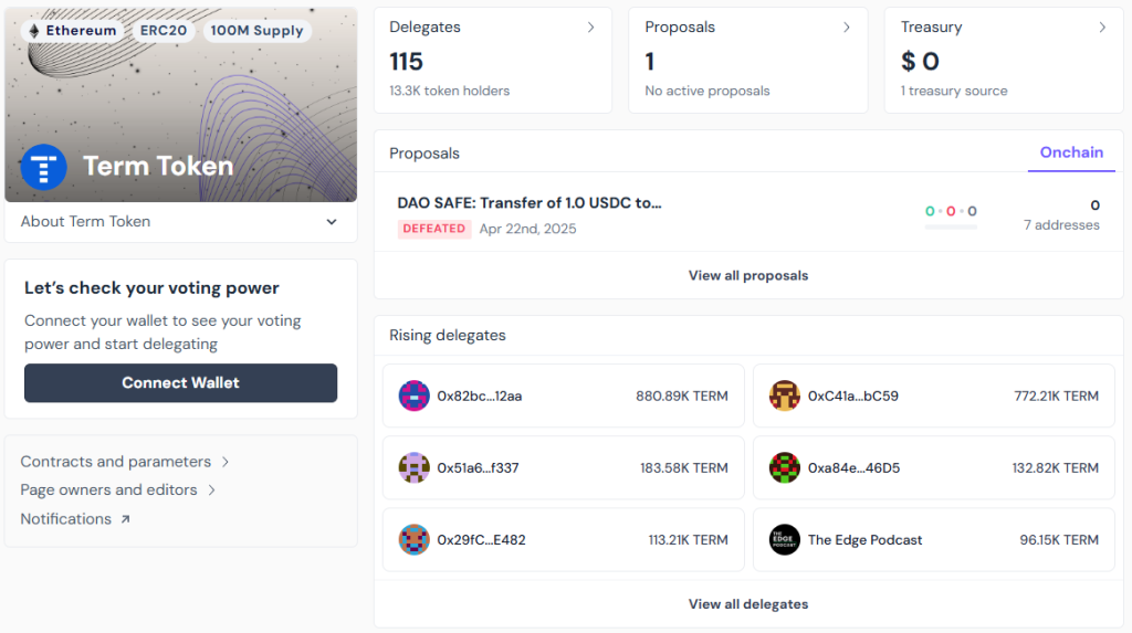 Termのネイティブトークンである$TERMは、プロトコルのガバナンス(運営参加)に使用されています。このトークンを保有し、ステーキングすることで、ユーザーはプロトコルの意思決定に関わる投票権を得ることができます。