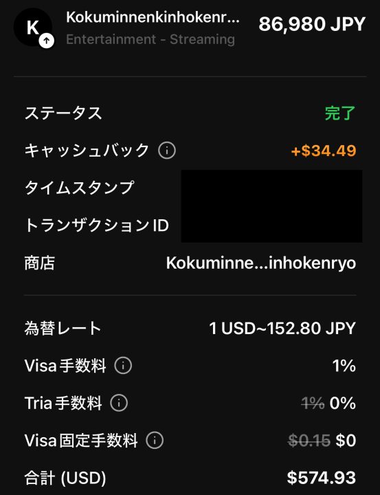 しかし、最強の仮想通貨クレカ「Tria」で決済した結果がこちらです。
