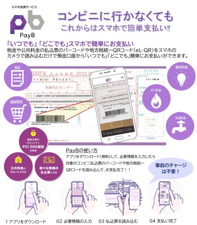 実はコンビニ払いの納付書(バーコードがついているもの)を、スマホアプリの「PayB」で読み込むことでクレジットカード払いが可能になります。