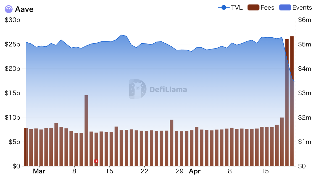 | 4月19日 | AaveのWETHプール利用率が100%に到達、預金者の出金停止。24時間で$5.4〜6.6B(約8,640億〜1兆560億円)のETH/WETHが流出 | 典型的なbank run発生 |