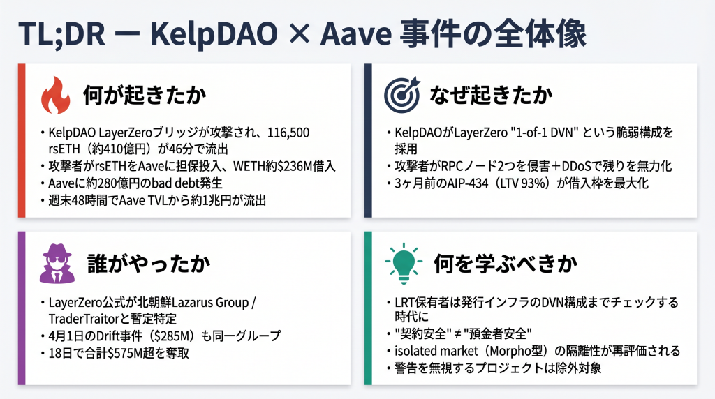 それでもKelpDAOは1-of-1構成を維持し続けた。今回の事件は、未知の脆弱性が偶発的に突かれたわけではなく、事前に指摘されていた危険が、国家級の攻撃者によって実際に突かれたというのが正確な表現である。