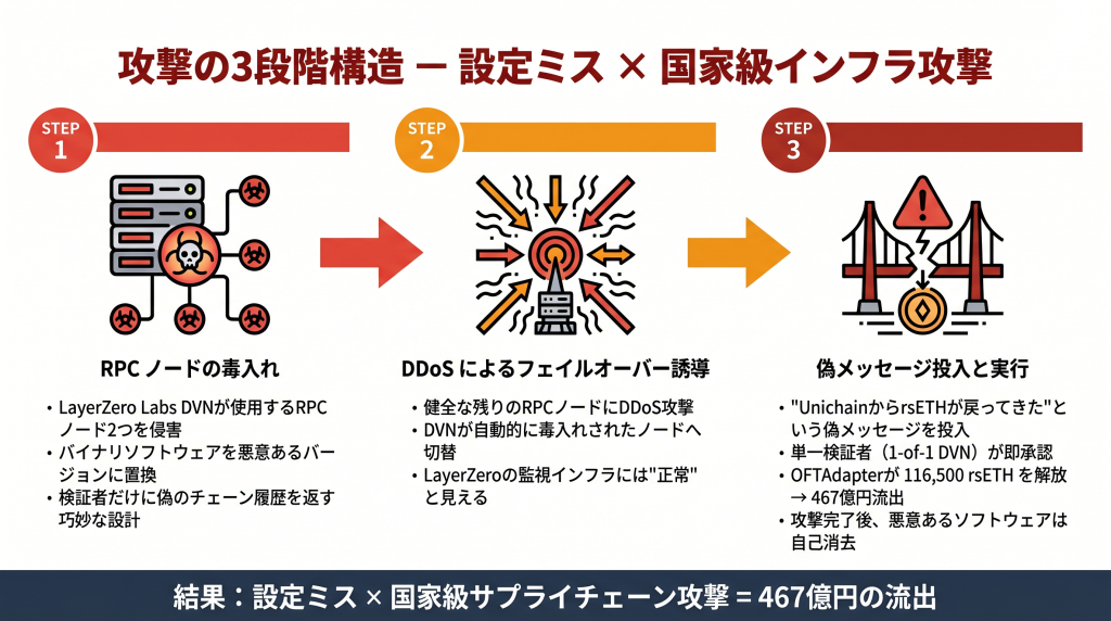 今回の攻撃の特異性は、スマートコントラクトのバグを突いたものではない点にある。KelpDAOのrsETHコントラクト自体には一切の欠陥がなかった。攻撃者が突いたのは、「このメッセージは本物である」とブロックチェーンに伝える役割を担う検証者(DVN)のインフラである。