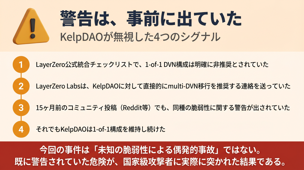 ここで重要なのは、1-of-1構成の危険性は以前から何度も指摘されていた点である。LayerZero公式の統合チェックリストにも「非推奨」と明記されており、LayerZero LabsからKelpDAOへ直接、multi-DVN移行を推奨する連絡も入っていた。15ヶ月前のRedditには類似の脆弱性への警告まで投稿されていた。