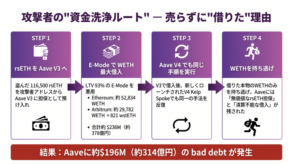 盗んだ116,500 rsETHをUniswapなどのDEXで即時売却すれば、大きなスリッページで、せいぜい数割しか現金化できない。「偽造rsETH」を、いかに大量の”本物の流動資産”に変換するか。ここが攻撃者にとっての肝だった。