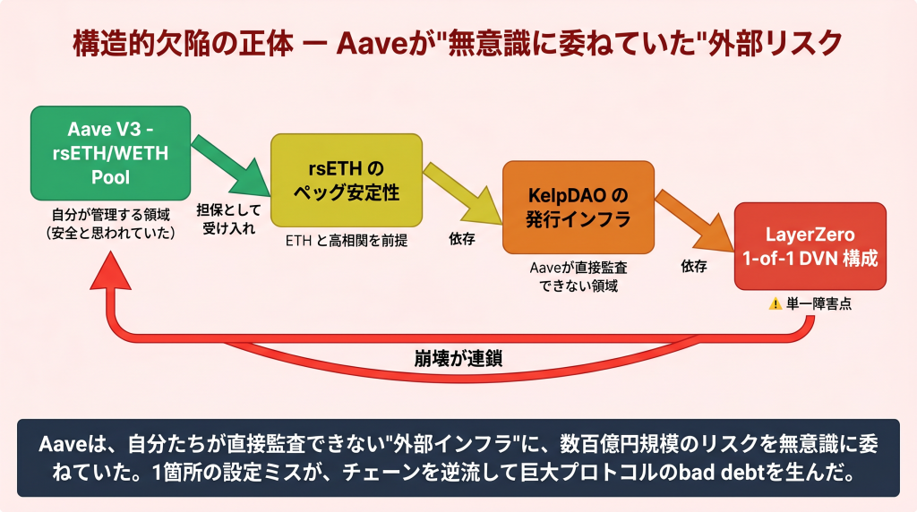 KelpDAO × Aave事件が示したのは、DeFiが直面する問題が「コードは安全か?」という一次元の問いから、「このプロトコルが依存している全てのインフラ層の設定は適切か?」という多次元の問いへと進化したことである。
