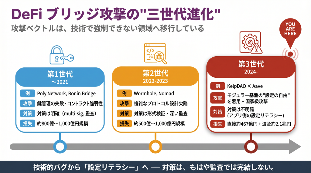 KelpDAO事件は、ブリッジ攻撃の”第3世代”を象徴する事件と位置付けて良いと考えている: