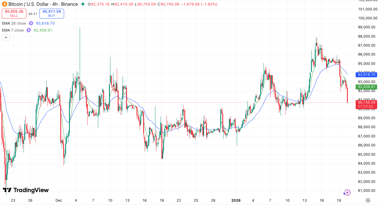 現在、ローソク足の実体が90,700ドル付近まで伸びており下値模索が続いています。もし90,000ドルを明確に割り込んで4時間足が確定した場合、失望売りが連鎖し次の主要サポートである88,000ドル(昨年末の揉み合い水準)まで一気に値を下げるリスクがあります。