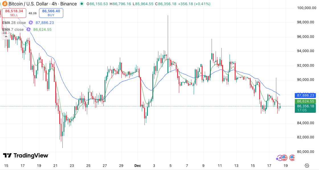 BTC/USDの4時間足チャートを分析すると、価格は一時85,000ドルを割り込む場面もありましたが、現在は86,356ドル付近で小康状態を保っています。