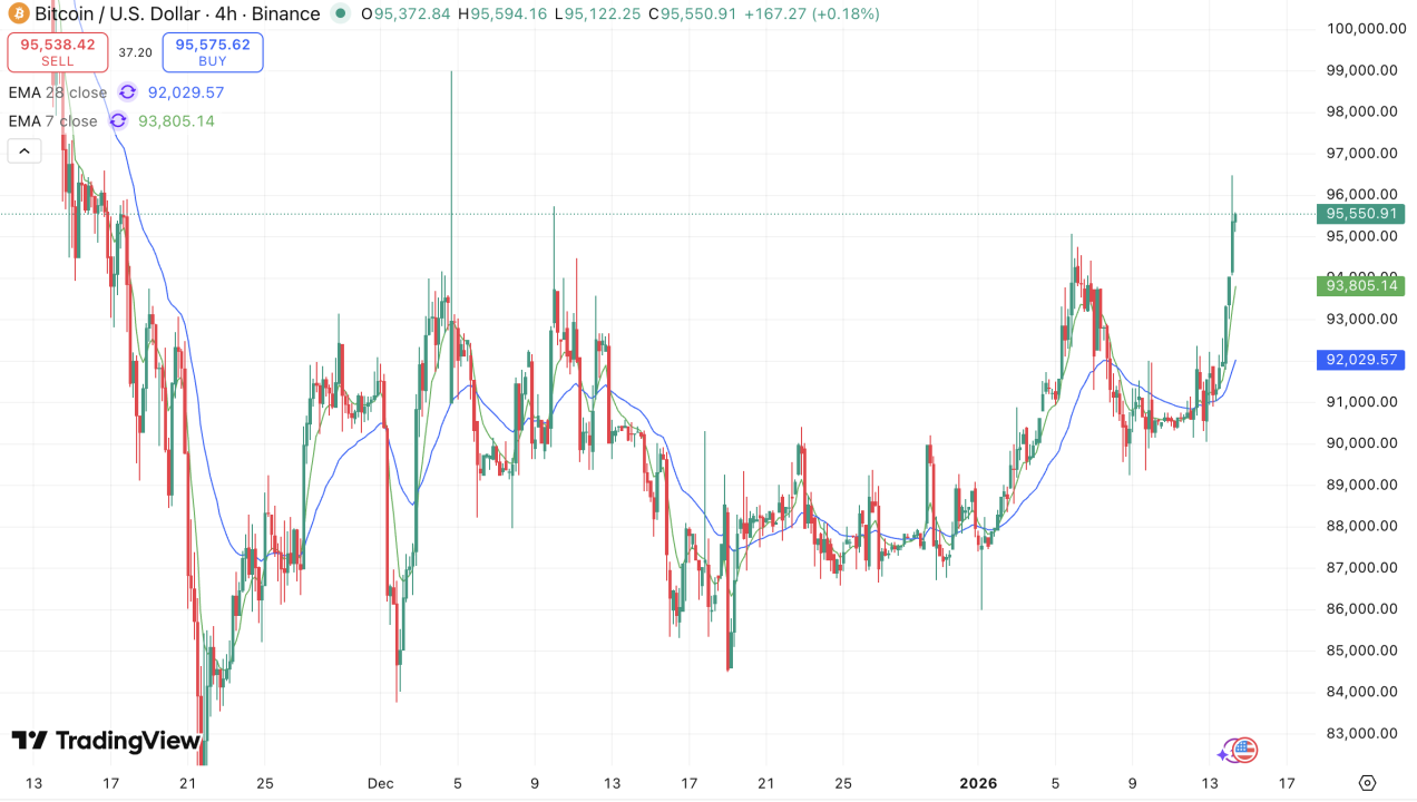 92,000ドルの壁を巡る攻防を制したビットコイン(BTC)は一気にアクセルを踏み込み、95,000ドル台半ばまで急騰しました。4時間足チャートでは長い大陽線が出現しており、溜まっていた空売りポジションの買い戻し(ショートカバー)を巻き込んだ強力な上昇トレンドが発生しています。