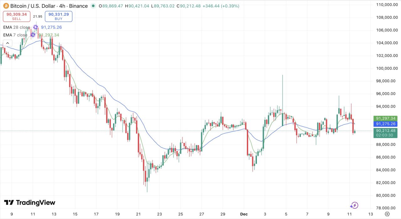 BTC/USDの4時間足チャートを分析すると、先日発生した「ゴールデンクロス」を追い風に一時94,000ドル付近まで上昇しましたがこの壁を突破できずに失速しました。