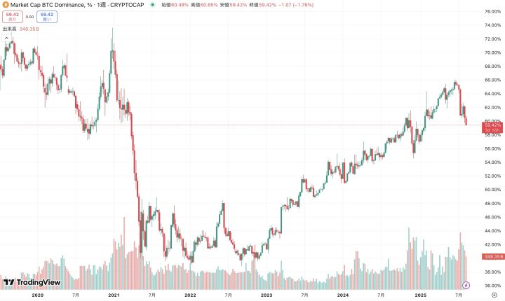 暗号資産市場に転換点が訪れている可能性が浮上しています。市場全体の資金動向を示すビットコインドミナンス(BTC.D)が、重要な節目である60%を割り込みました。