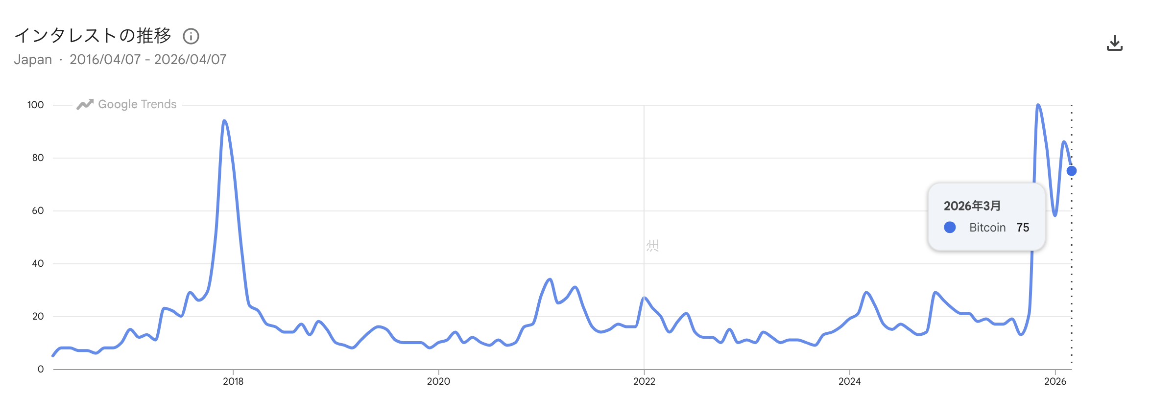 また企業の財務資産としての組み入れや銀行によるインフラ整備が進んだことで、個人が取引所の口座を開設し複雑なウォレットを管理する必要性が低下しています。その結果、価格が上昇しても新規参入者による検索行動が爆発的に増えない現象が起きています。
