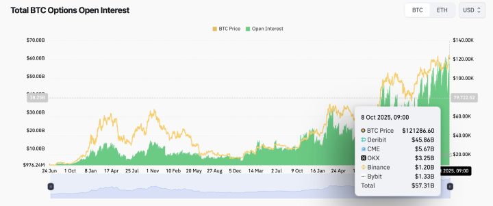 データによると、ビットコインのオプション市場の建玉(オープンインタレスト)は今年に入り急増し、初めて先物市場に匹敵する規模に達しました。