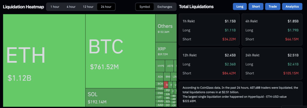 リクイデーションの95%以上がロングポジションで、約40万9,504人のトレーダーが影響を受けました。最大の単一リクイデーションは、HyperliquidにおけるETH-USDの2.23億ドルでした。