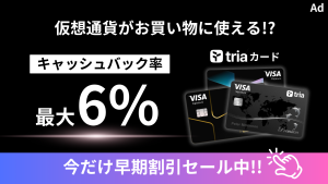Triaカードは世界中どこでも決済が可能な仮想通貨クレジットカード(約3000円〜)で、驚愕の最大6%が仮想通貨でキャッシュバックされます。さらに、予定されている仮想通貨の無料配布では先行登録者に大きなチャンスも!!