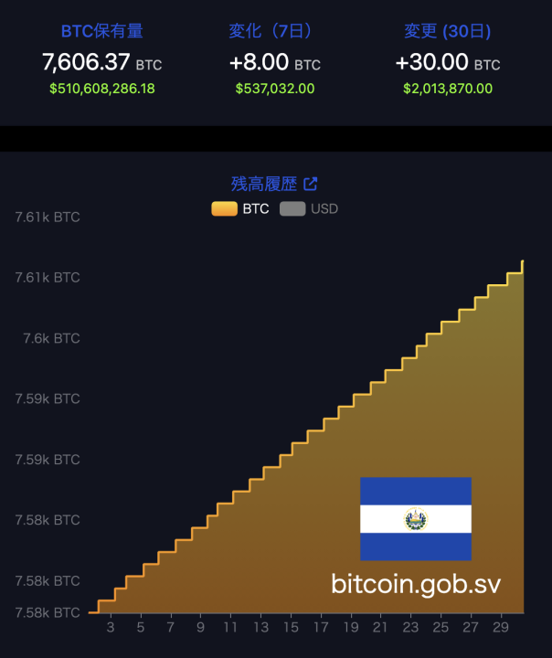 直近の運用状況を見ると過去7日間で8.00 BTC、過去30日間では30.00 BTCの増加が記録されており、エルサルバドルが継続的にビットコインを積み増している実態が浮き彫りとなりました。ナジブ・ブケレ大統領が掲げる「毎日1 BTCを購入する」という方針が着実に継続されていることが確認できます。