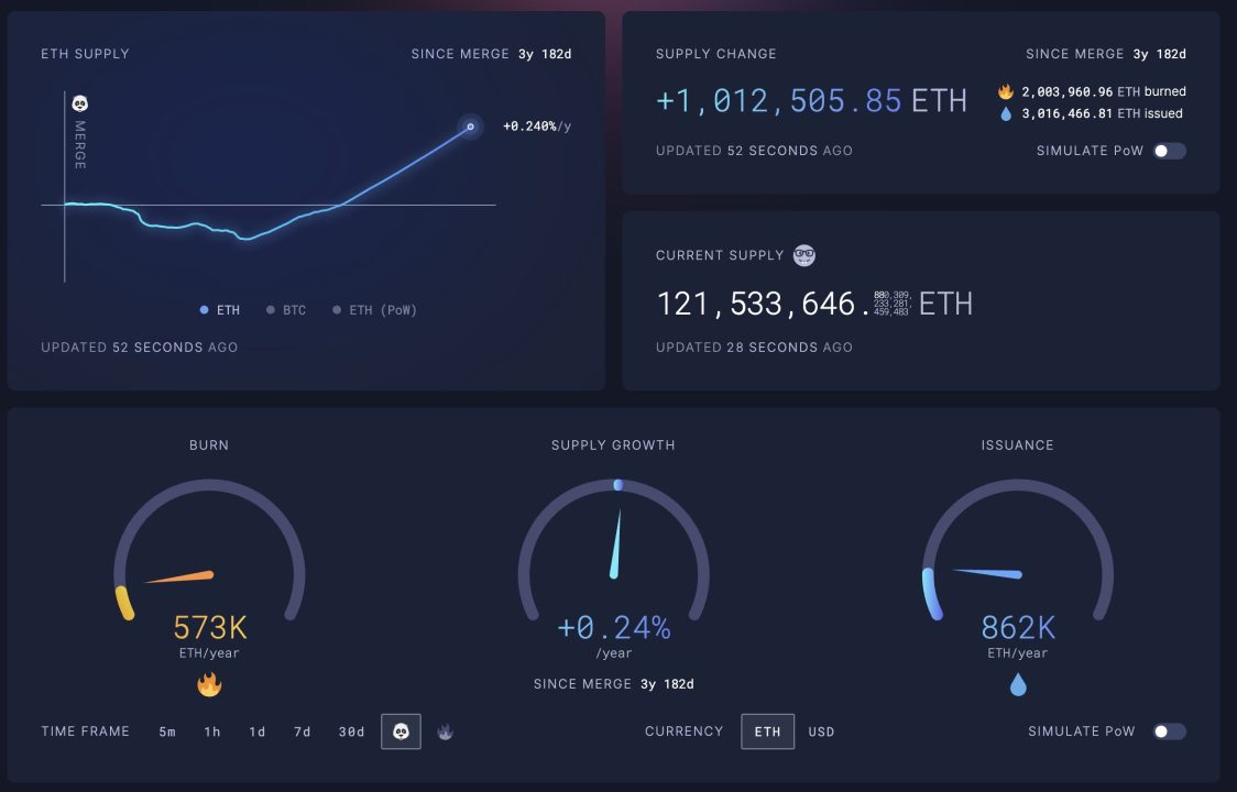 現在のイーサリアムの総供給量は約1億2,153万ETHに到達。マージ以降の年間換算インフレ率は約0.24%となっており、供給量が減少する「デフレ資産」としての側面よりも緩やかなインフレ傾向にある現状が浮き彫りとなりました。
