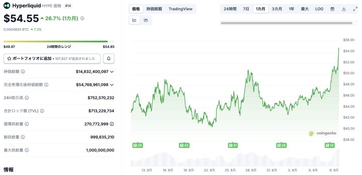 分散型デリバティブ取引所ハイパーリキッド(Hyperliquid)のネイティブトークンであるHYPEが9日、価格を急騰させ史上最高値を更新しました。同トークンは一時54.77ドルを記録し過去24時間で9.1%の上昇を見せています。