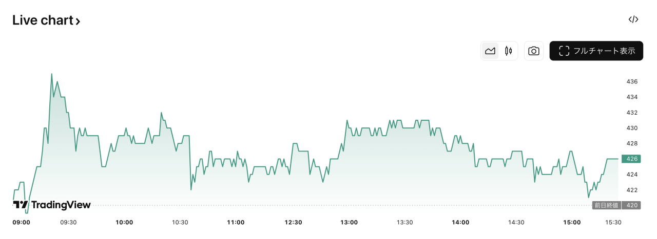 この日のメタプラネットの株価は取引開始直後に一時436円を超える水準まで上昇。しかし、買いの勢いは続かずその後は420円台後半を中心とした狭い範囲での値動きに終始しました。終値は前日比6円高の426円でした。