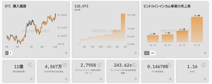 メタプラネットはビットコイン財務戦略の採用以降、リターンが一時2,795%に達するなど目覚ましい成長を遂げてきました。ビットコイン関連事業の売上高も2025年第3四半期には24.4億円に達するなど事業は拡大基調にあります。