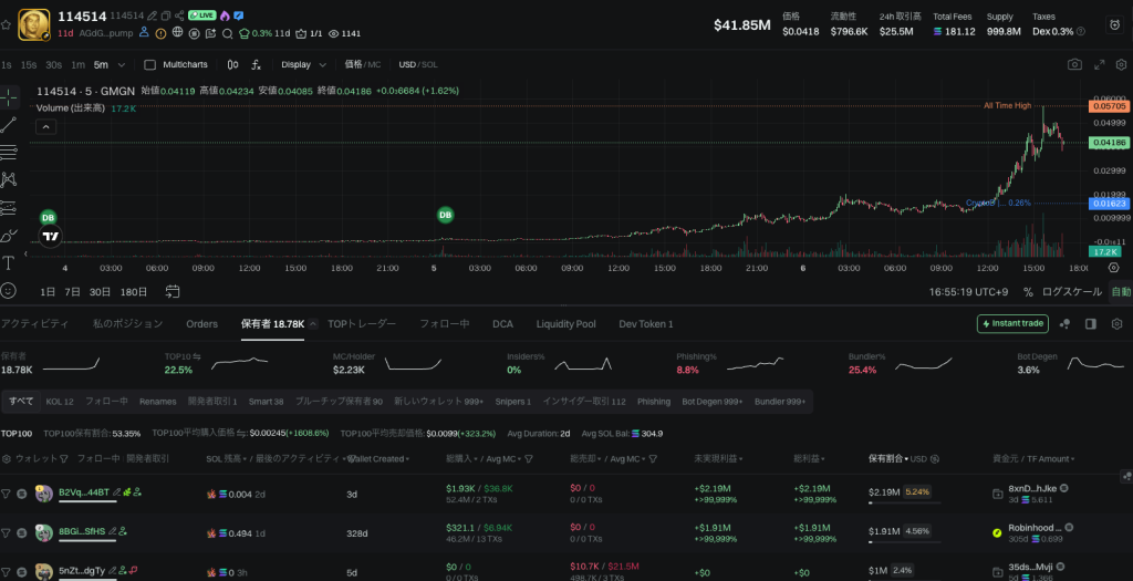 同トークンは2025年12月25日にSolanaブロックチェーン上のローンチパッドプラットフォーム「pump.fun」を通じて日本人により発行され、記事執筆現在の時価総額は約4,320万ドル(約70億円)に達し、24時間取引量は1,770万ドルを超えています。