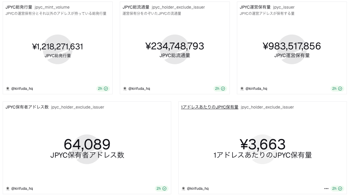 一方で、1アドレスあたりの平均JPYC保有量には減少傾向が見られます。20日時点では1アドレスあたり5767円でしたが27日時点では3663円となりました。この平均保有額の低下とアドレス数の急増を併せて分析すると、大口の投資家だけでなく少額を保有する一般ユーザーや小口の利用者が急速に流入している可能性があります。