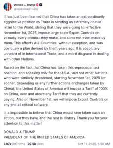 2025年10月10日、仮想通貨市場で記録的な規模の暴落が発生しました。トランプ大統領が100%の追加関税を中国に課すとともに全ての重要な米国製ソフトウェアに輸出規制を適用すると表明したことを受け、市場全体でパニック売りが広がりました。