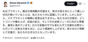 ビットコイン戦略を進めるメタプラネットのCEOサイモン・ゲロビッチ氏が2月6日、株価下落について株主に向けたメッセージをXで発信しました。