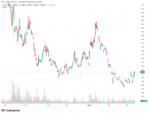 同社株は3月11日時点で369円(前日比+15円、+4.24%)と上昇しています。3月初旬には一時300円を割り込む場面がありましたが、先週5日には前日比+15%の急騰を記録するなど、株主総会を前に反転の動きが見られます。