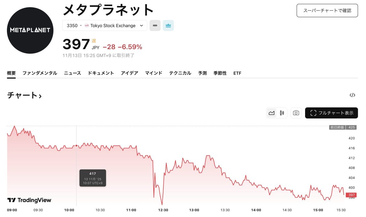 13日の東京株式市場において、メタプラネット(Metaplanet)の株価が大幅に下落しました。この日の取引は前日比28円安、率にして6.59%安となる397円で終了しました。