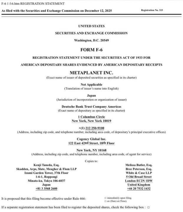 日本を拠点とするメタプラネットが12月12日、米国証券取引委員会(SEC)に対し米国預託証券(ADS)の登録を目的とした「Form F-6」を提出しました。この手続きは同社が米国市場において、より広範な投資家層からの資金流入を可能にするための体制整備を進めていることを示しています。