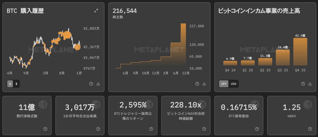 メタプラネットに対する投資家からの関心は依然として高い水準にあります。今後の株価動向については、ビットコイン市場の回復および同社が推進する財務戦略の進捗が重要な鍵を握る展開が続くと予想されます。