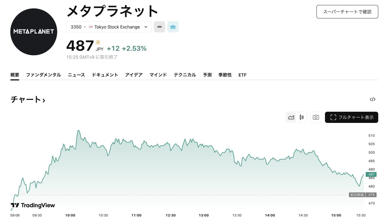 10月30日の東京株式市場で、株式会社メタプラネット(東証スタンダード:3350)の株価は前日比12円高(+2.53%)の487円で取引を終えました。