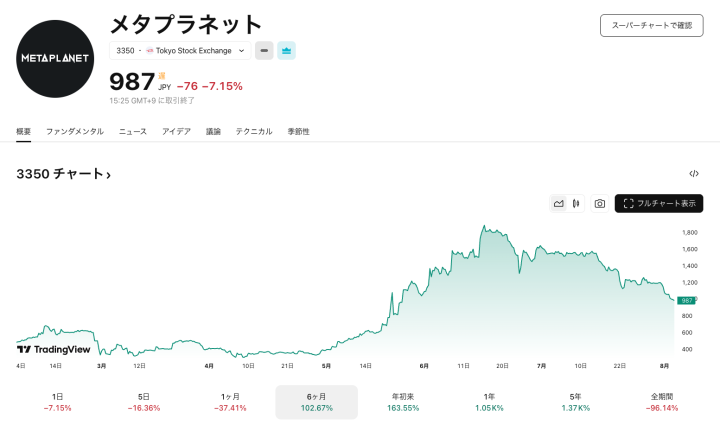 メタプラネットの株価は8月4日16時時点で987円まで下落。これは24時間で7%以上の下落となります。同社の株価は6月16日に1845円の高値を記録していましたが、そこから約1ヶ月半で約46%の下落となりました。