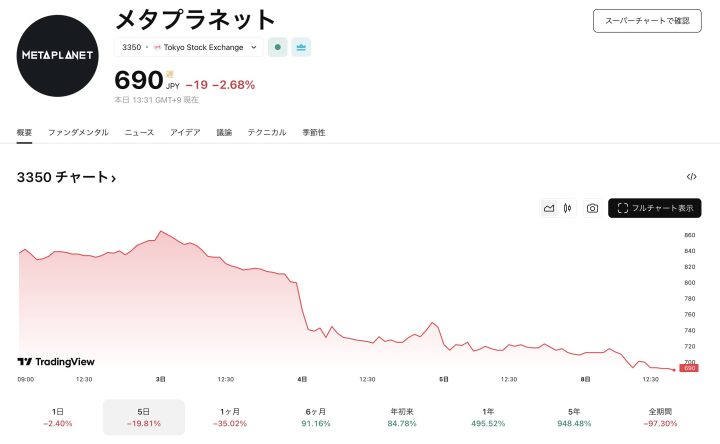 ビットコイン(BTC)を財務資産として大量に保有する株式会社メタプラネットの株価が、9月8日の取引で一時690円まで下落し700円を割り込みました。同社はこの日、約22.5億円で136 BTCの追加購入を発表しましたが株価の下げ止まりには至りませんでした。