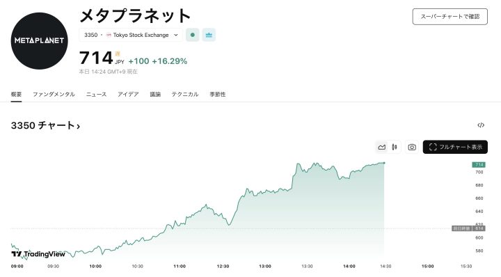 しかし、売りが一巡すると大規模な資金調達によるビットコイン戦略の強化を好感した買いが殺到。株価は急反発し前日比100円高(+16.29%)の714円まで急騰しました。※記事執筆時