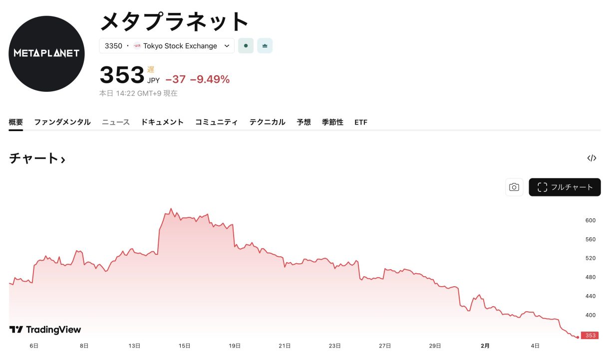 ビットコイン(BTC)の価格下落に伴い、メタプラネットの株価が1ヶ月で31%下落しています。