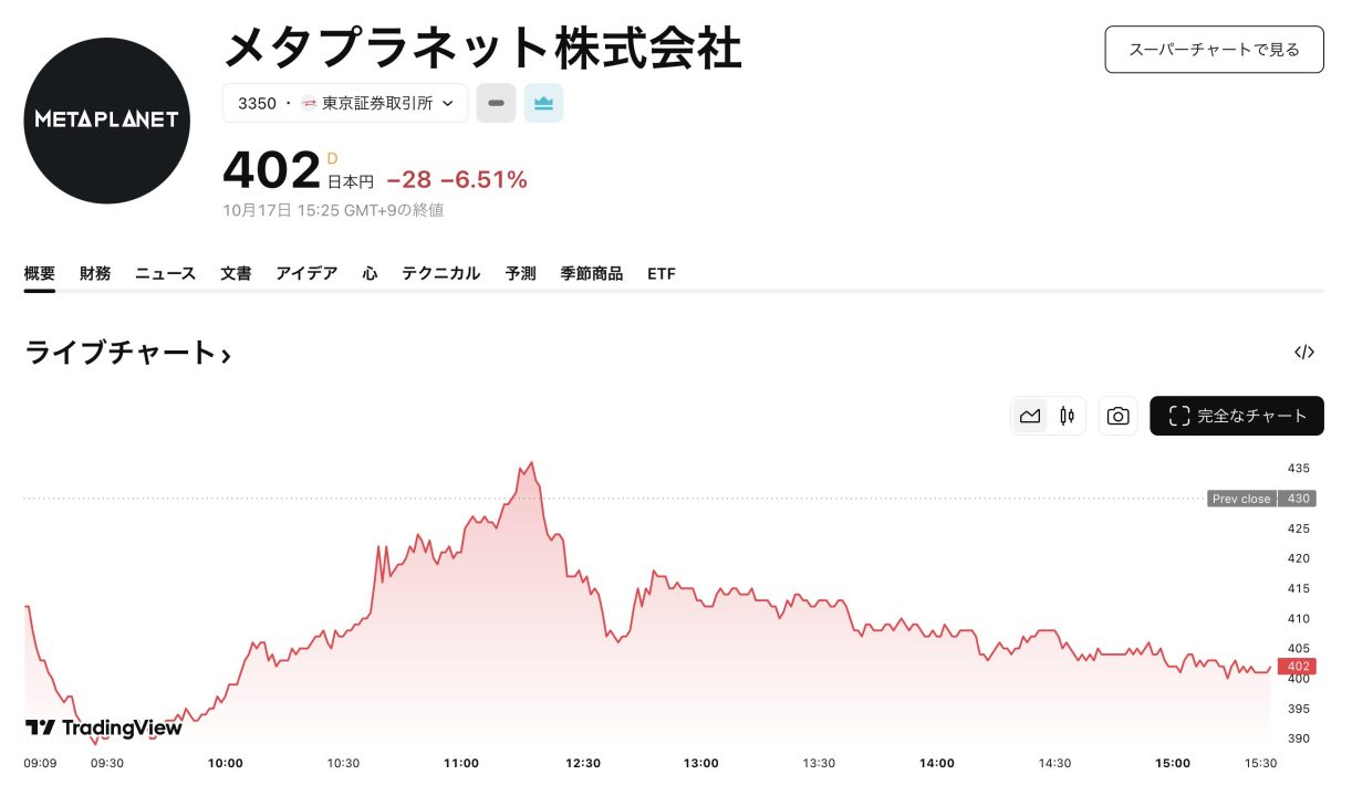 株式会社メタプラネットの株価が下落。10月17日の東京証券取引所における取引で、同社株は前日の終値から28円安い402円で引け下落率は6.51%に達しました。