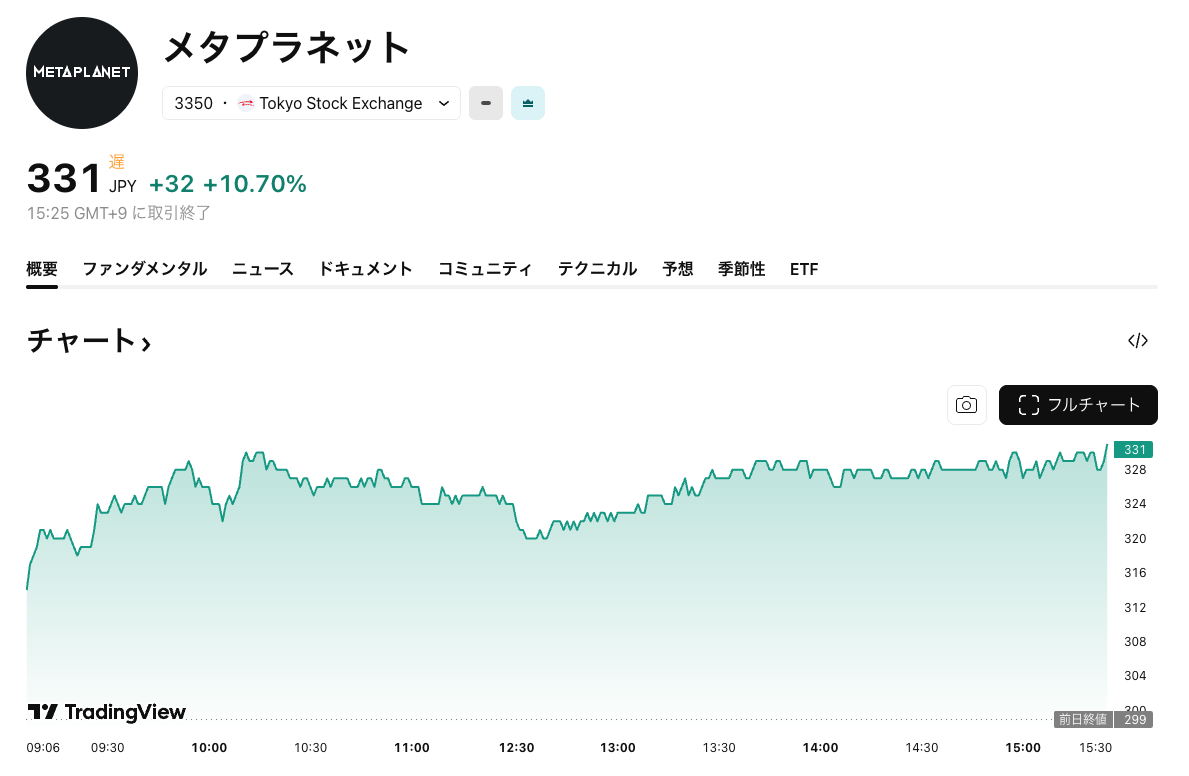 日本の上場企業であるメタプラネットの株価が10%の大幅な急騰を記録しました。