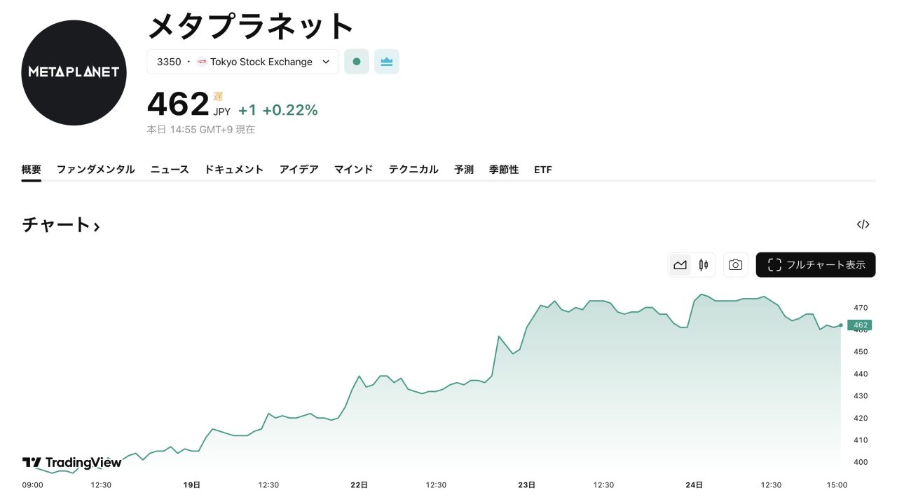 メタプラネットの株価が回復基調を強めています。直近5日間で13%、過去1ヶ月間では26%の上昇を記録しています。