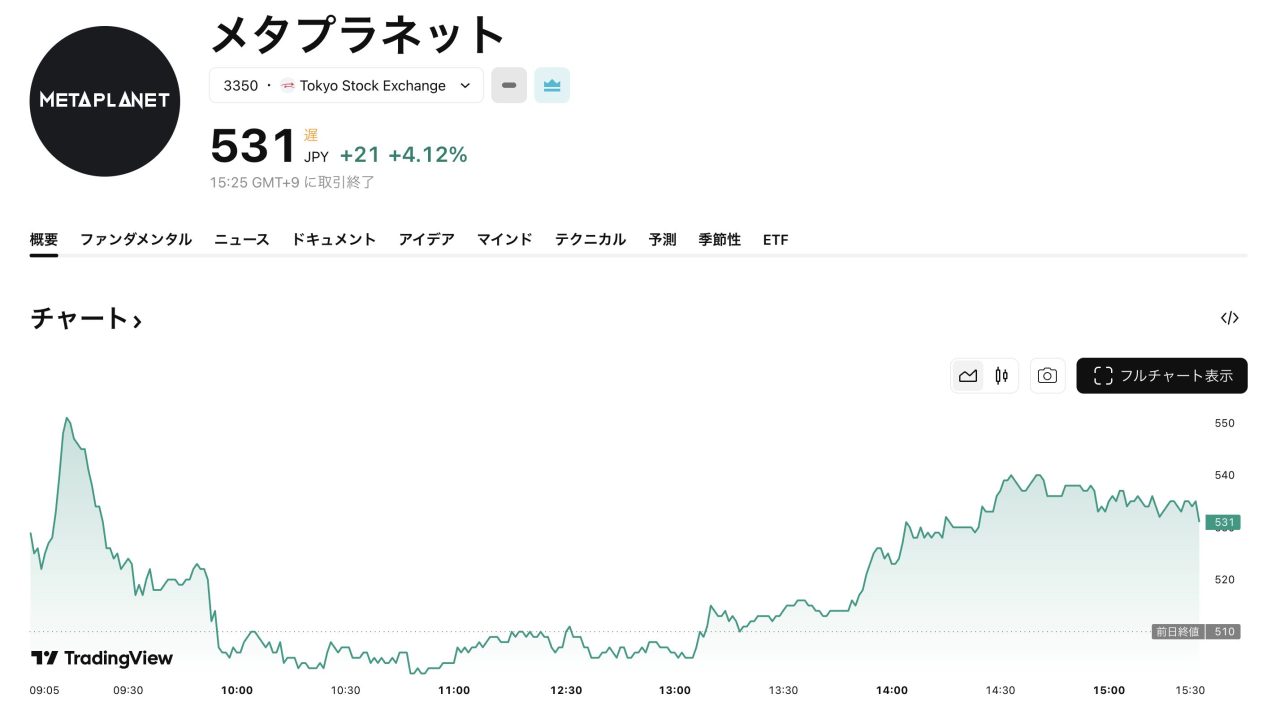 メタプラネット株4%高騰、MSCIによる指数除外見送りが影響か