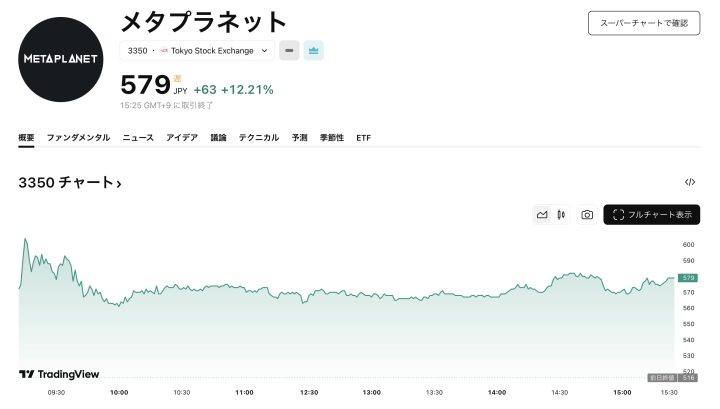 メタプラネット株がV字回復!前日の下落から一転12%高騰