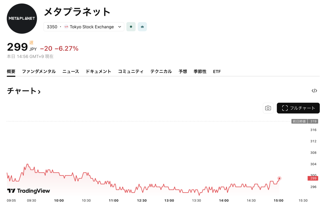 メタプラネット株価300円割れ、年初来31%下落