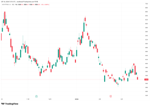 今年初めから2月にかけては見事な上昇相場を見せていましたが、その後は全体的な調整局面に入っていることがチャートから読み取れます。