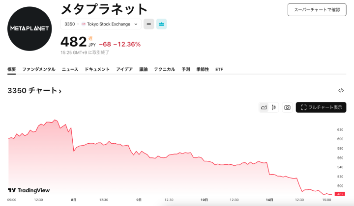 株式会社メタプラネット(証券コード:3350)の株価が10月14日の取引で大幅に下落しました。終値は前日比68円安(-12.36%)の482円となり厳しい一日となりました。