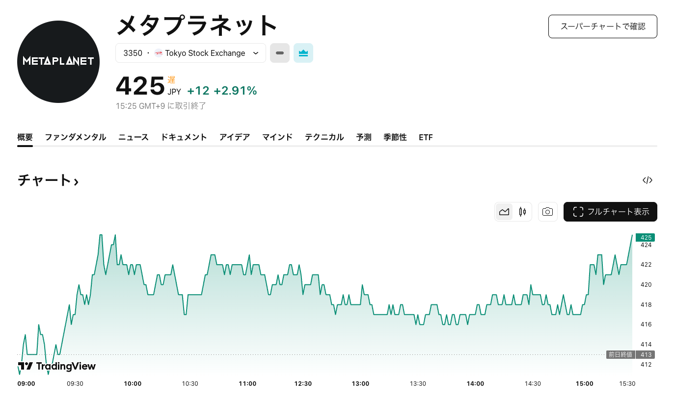 株式会社メタプラネット(Metaplanet)の株価が上昇し、終値は425円を記録しました。これは前日の終値413円と比較して12円高であり、率にしてプラス2.91%の上昇となります。