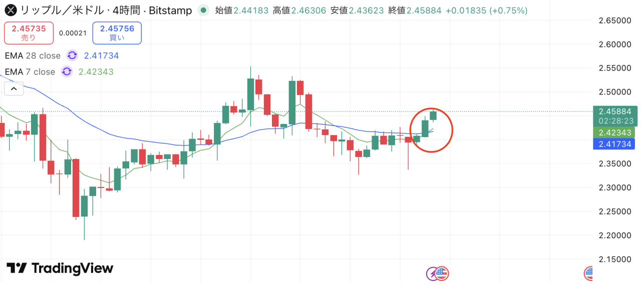 XRP/USDの4時間足チャートを詳しく見ると、短期の7期間指数平滑移動平均線(EMA)が中期的なトレンドを示す28期間EMAを上抜ける「ゴールデンクロス」が形成されていることが分かります(上図赤丸部)。