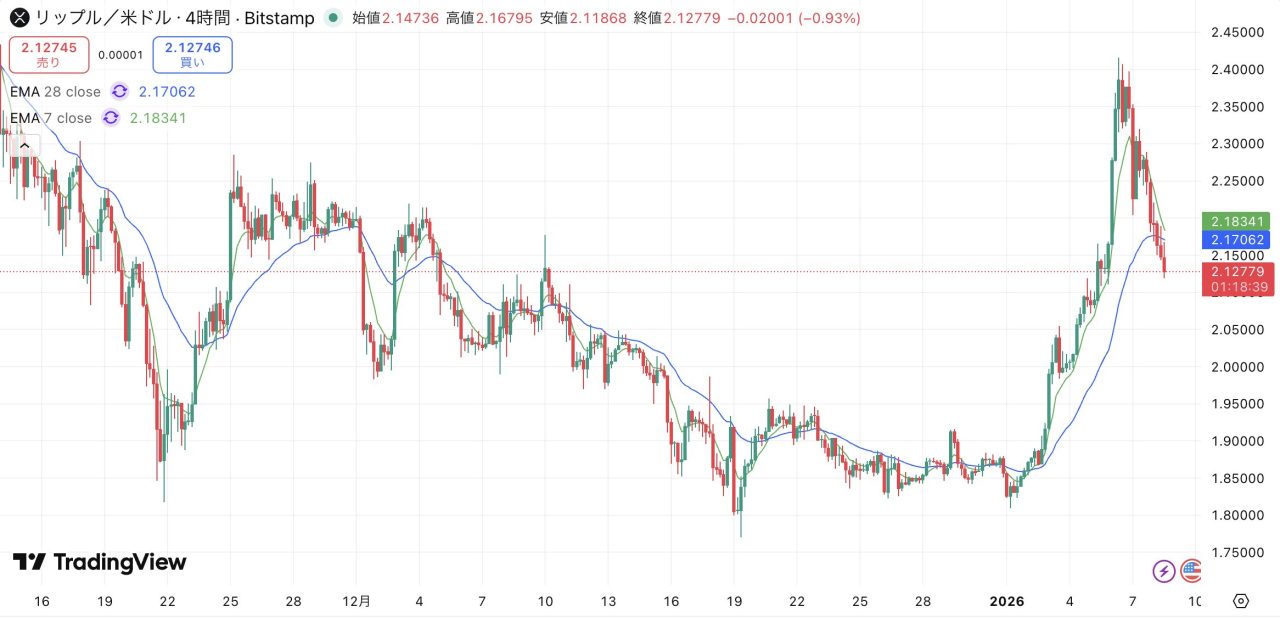 リップル(XRP)、調整深化で2.12ドルへー中期EMAも割り込み【仮想通貨チャート分析】