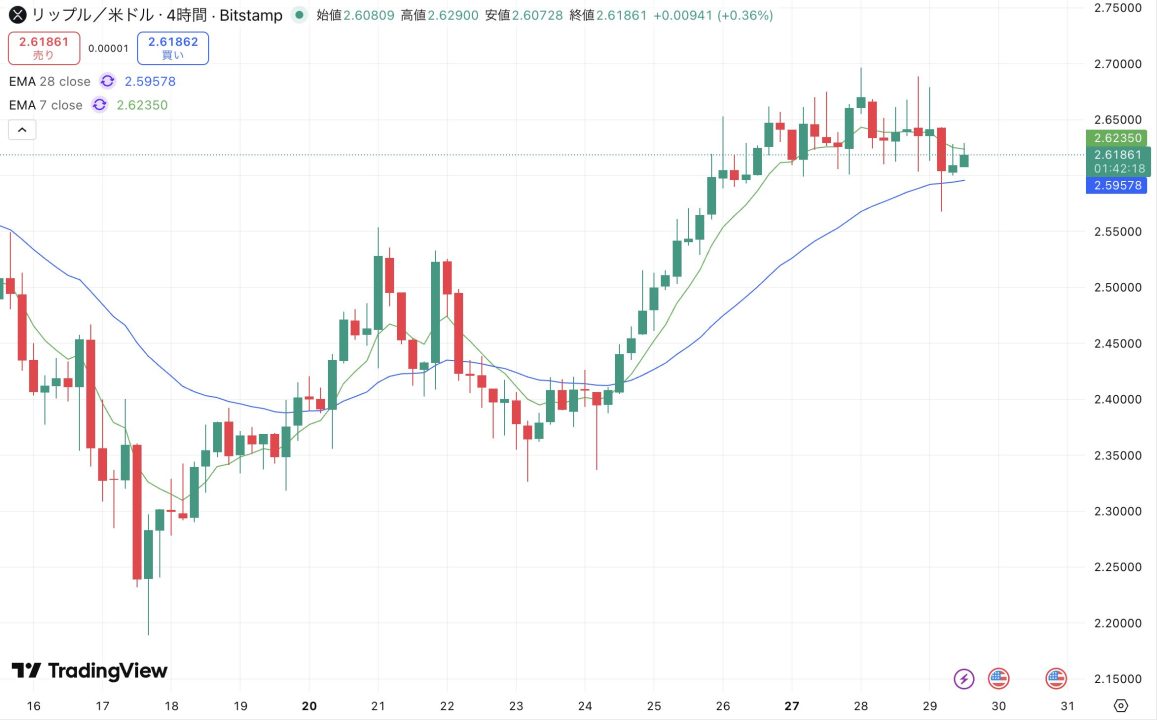 もしXRP価格がこの28期間EMAを明確に下回ることなく反発に成功すれば、上昇トレンド継続のサインと見なせます。
